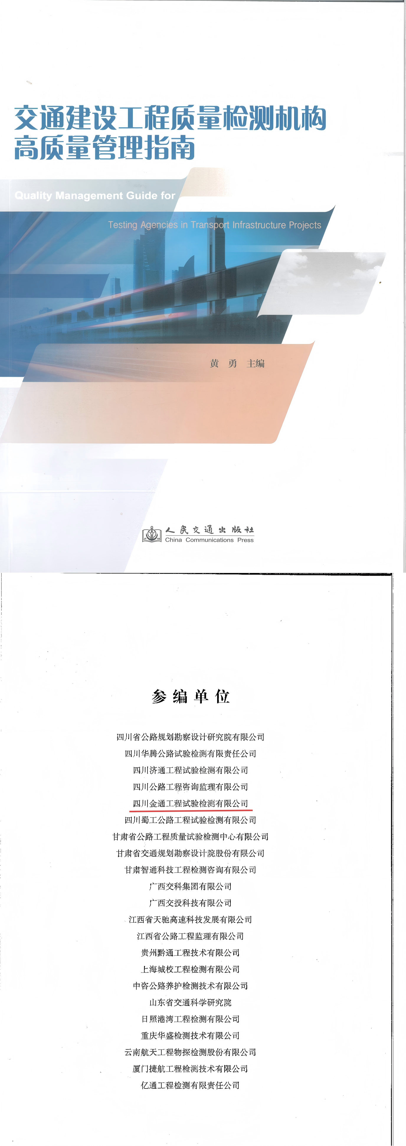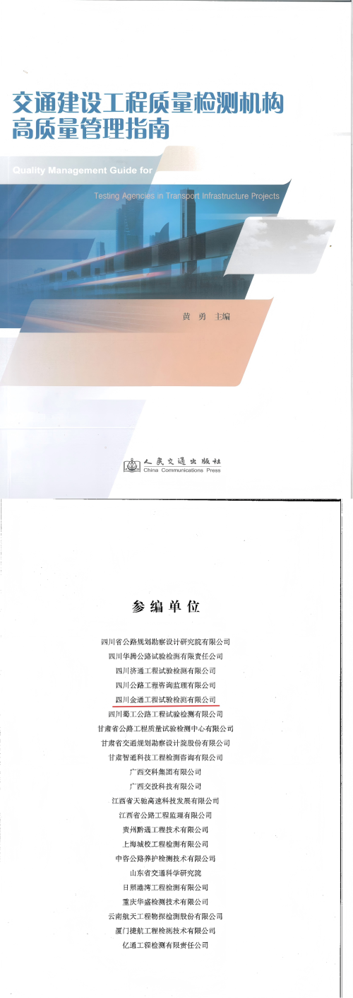 近日,由四川金通工程试验检测有限公司等单位共同参编的《交通建设工程质量检测机构高质量管理指南》已由权威出版机构人民交通出版社正式出版发行,并于2025年9月与广大读者见面。该指南的出版,标志着我国建设工程质量检测领域在规范化、标准化、高质量发展方面迈出了坚实而重要的一步。