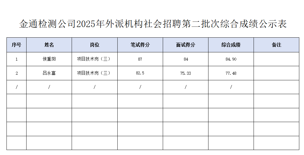 现将四川金通工程试验检测有限公司2025年外派机构社会招聘综合成绩予以公示。